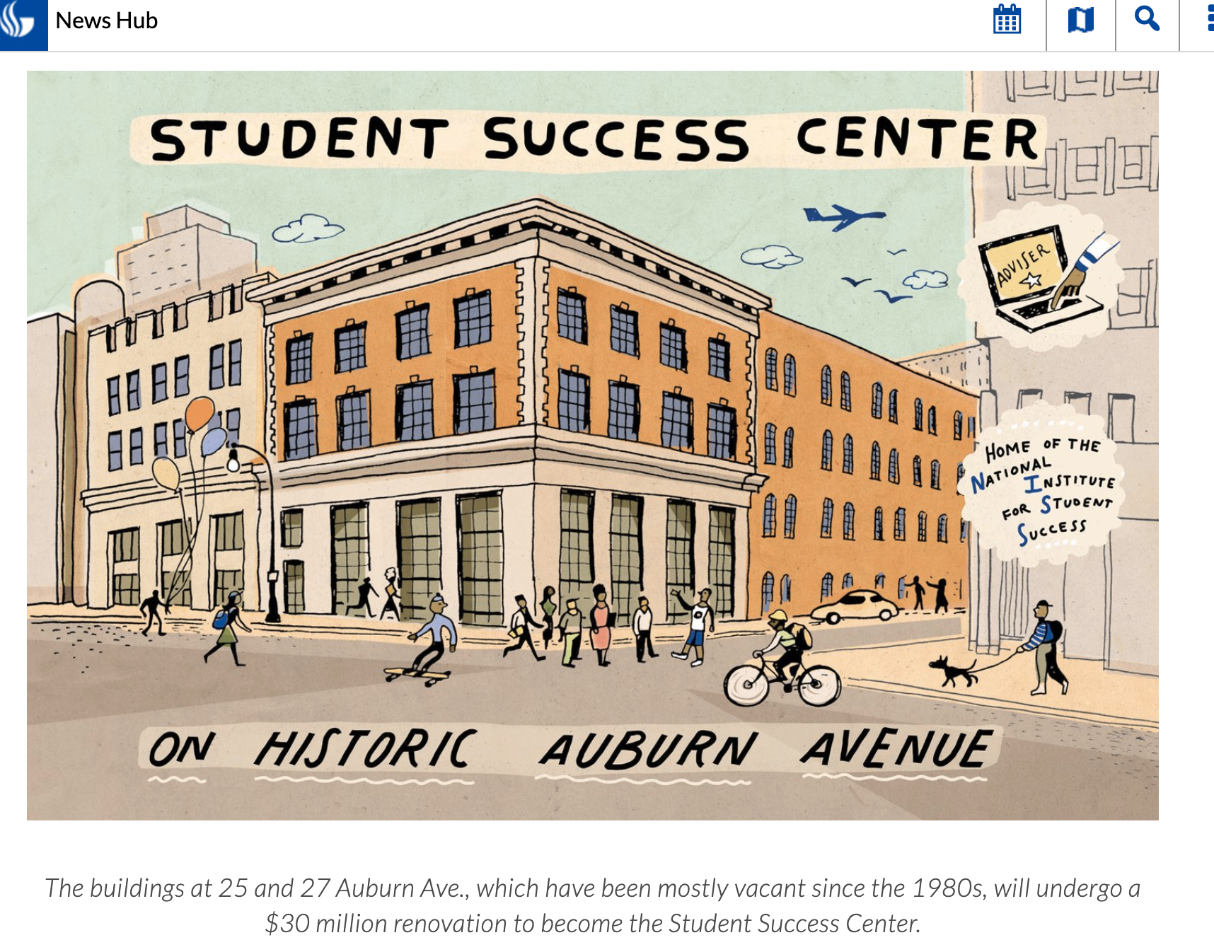 From the article: “Thanks in part to a transformational gift from the Robert W. Woodruff Foundation of $15 million — one of the largest in Georgia State history — the building will gain new life through a $30 million renovation project. Expected to be complete in early to mid-2024, the Student Success Center will house a number of student-facing services.”